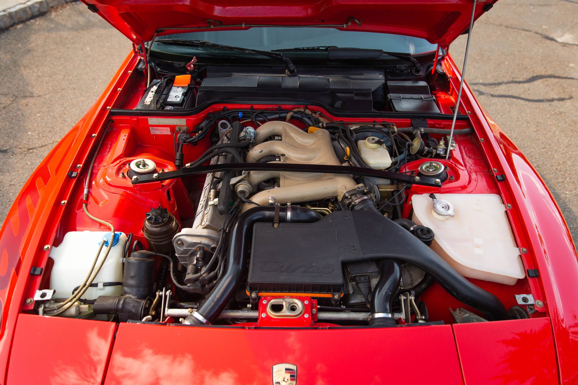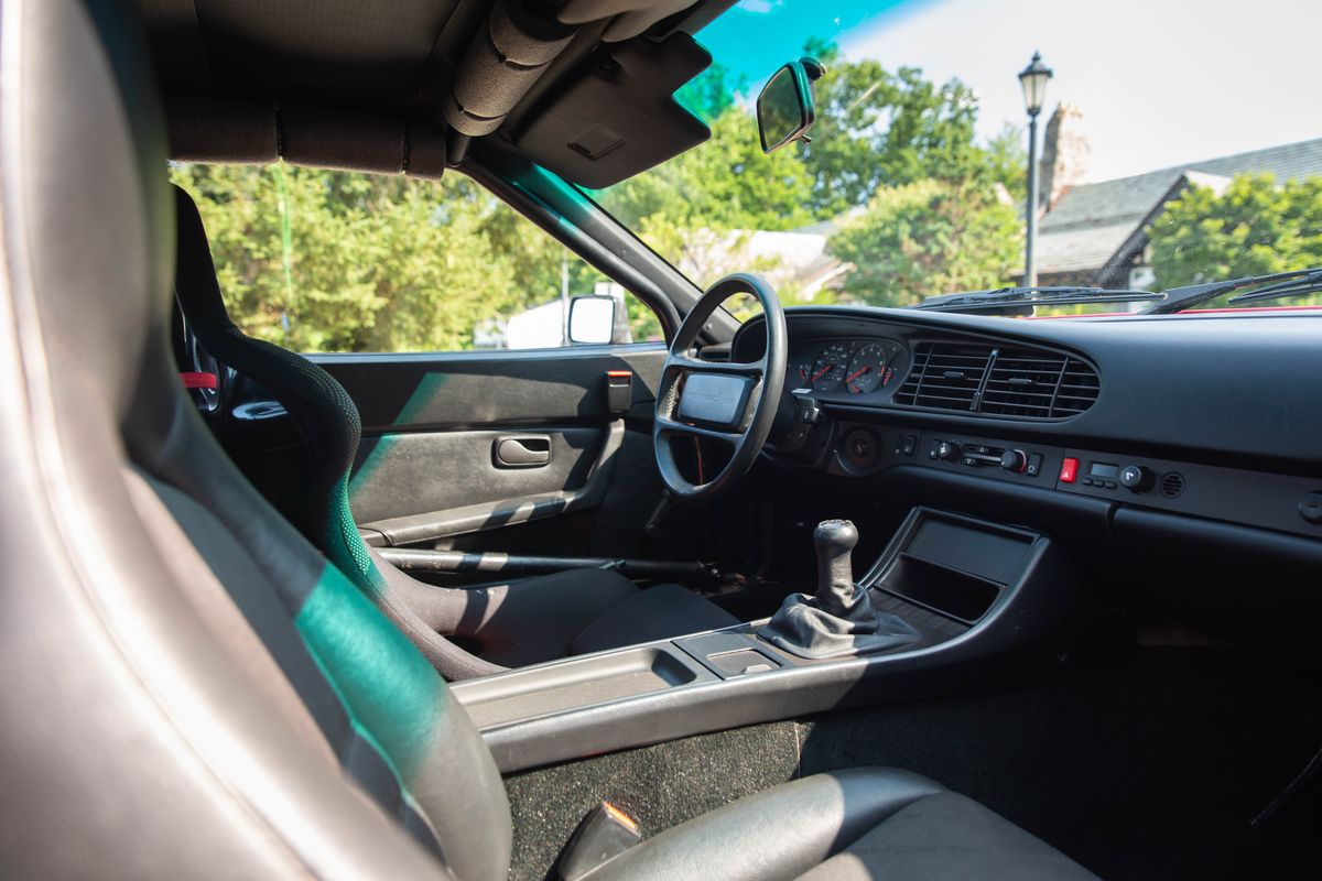 From mid-1985 through 1989, Porsche hand-built a limited number of 944 Turbo Cups, with only 129 leaving Zuffenhausen through the end of production. Although some referred to the Turbo Cup series as “showroom stock” racing, due to the fact that the cars were delivered in road-legal configuration with titles, the 944 Turbo Cups were anything but showroom stock, being delivered from factory with numerous lightweight parts, bolt-in Matter roll cages, and significantly increased power over a standard 944 Turbo. This lightweight approach included manual windows, no sunroof or air conditioning, a fiberglass hood, the use of magnesium for various engine components such as the intake and oil sump, and other lightweighting measures. On this strict diet, the 944 Turbo Cups weighed in at roughly 2,500lbs, nearly 600lbs less than a standard, road-going 944 Turbo. As if the diet wasn’t enough, power output was increased to approximately 300hp by a larger Kuehnle, Kopp and Kausch K26-8 turbocharger and remapped ECU tuning. A reinforced gearbox, axles, a limited-slip differential, and performance clutch were equipped to assist with putting the additional power to the ground.